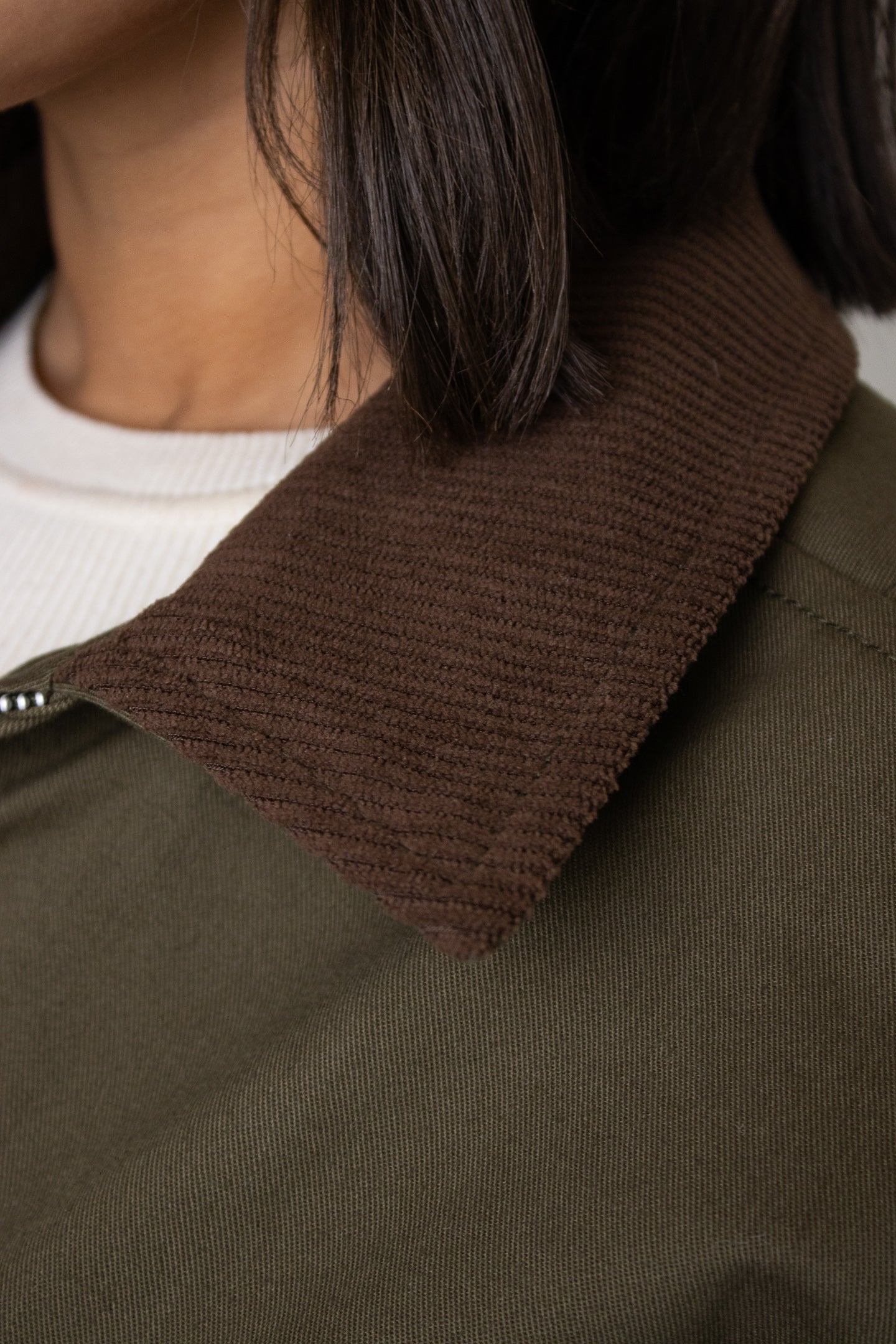 Timeless and versatile gabardine jacket in warm beige and olive shades with a rich brown collar. Features two seamless pockets for effortless style, perfect for layering over your everyday outfits with a polished, structured look.