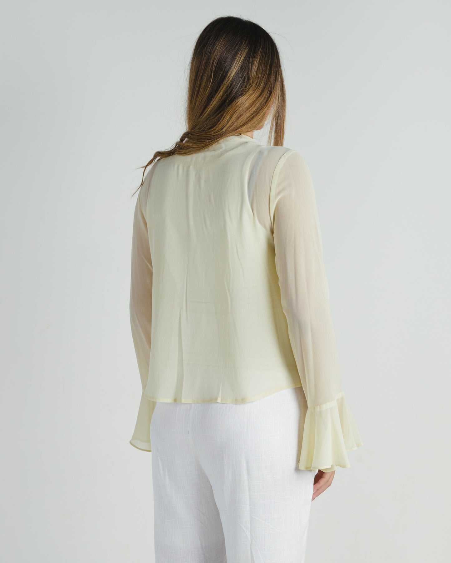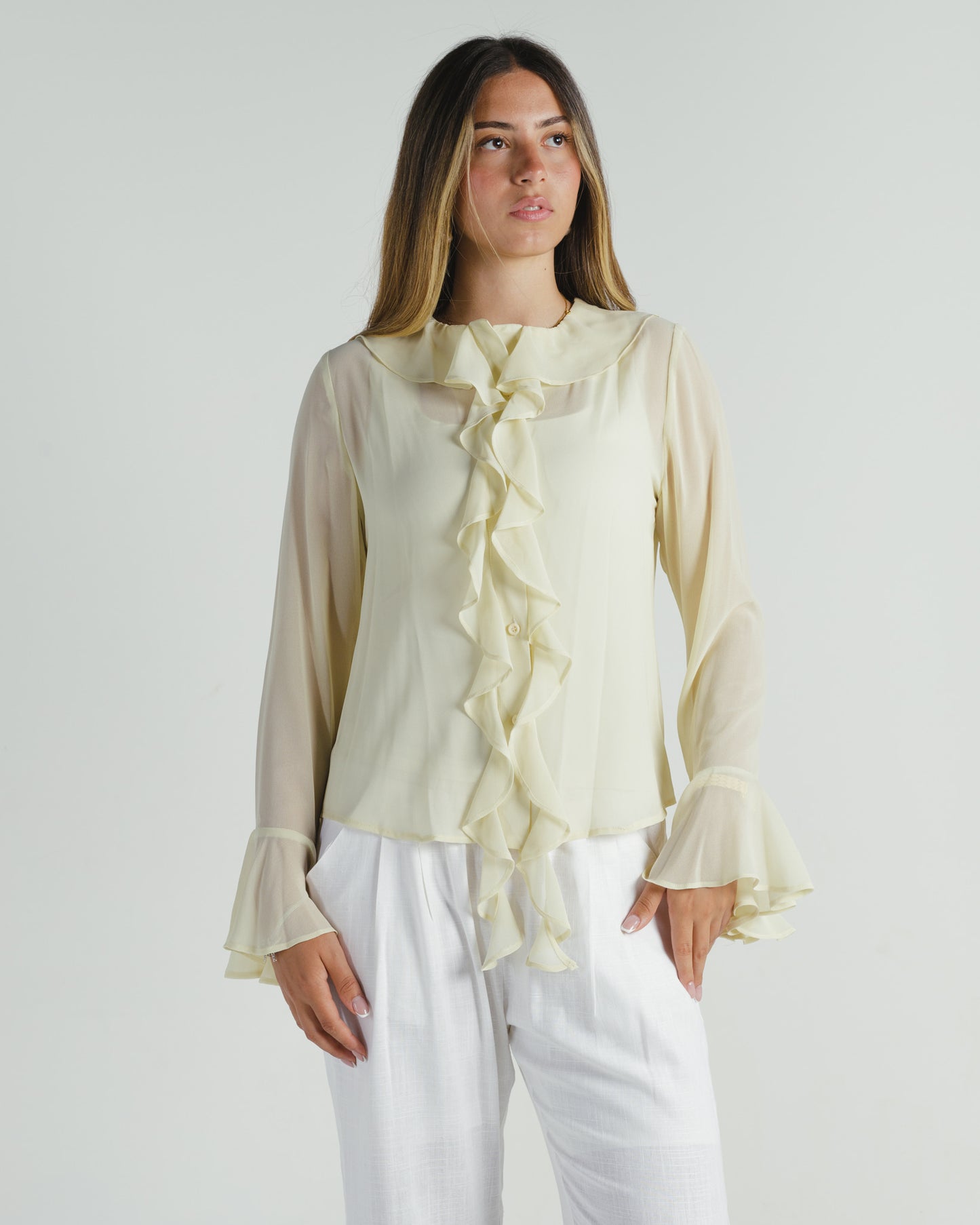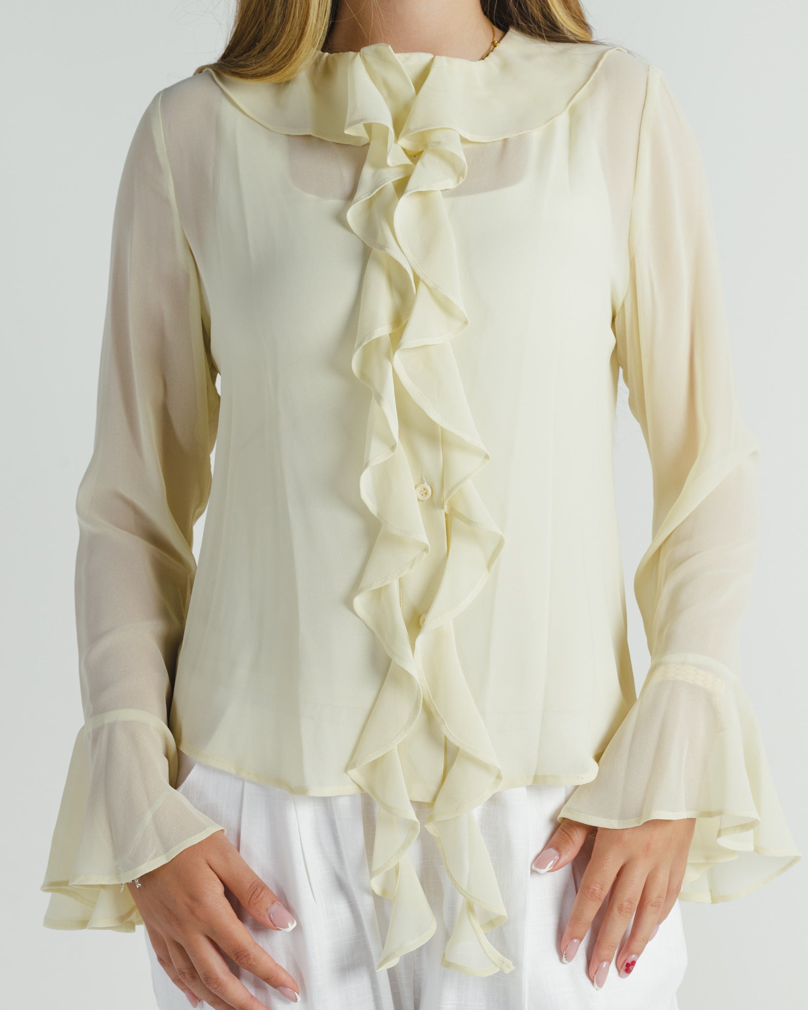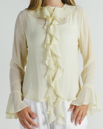 The Whisper Blouse brings back the elegance of a classic design with a modern twist. A vintage-inspired piece, it captures timeless charm through its flowing silhouette and delicate details. Featuring understated ruffles, suitable for both casual and elegant settings.